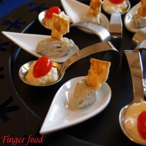 Nei cucchiai di porcellana: Mousse di Roquefort,noci e pere alla cannella ( realizzata mescolando pari quantità di ricotta e Roquefort,alcuni gherigli sbriciolati di noce ed alcuni pezzettini di pere,passati velocemente in padella e spolverizzati con cannella.)