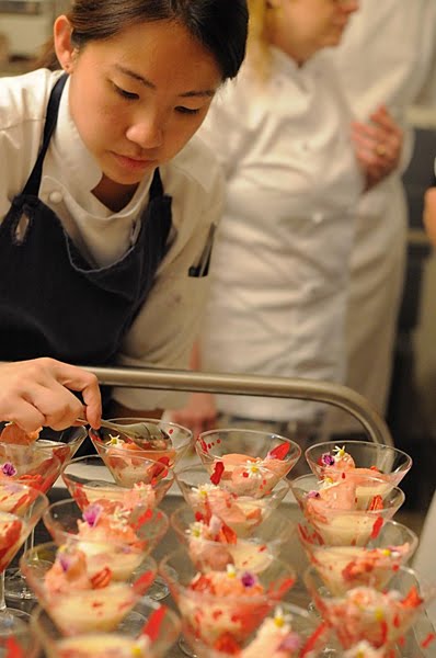 Fiori provenienti da Singapore da posizionare in modo millimetrico sul piatto,polvere dorata che volava,40 piatti che dovevano andare fuori contemporaneamente assolutamente perfetti,30 minuti per prepararli con 5-6 persone sul piatto,gelati e sorbetti che non potevano attendere!!
