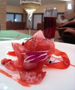 L’orchidea rossa,cremoso al lampone coni gelatina al lampone e fragola, salsa al lampone, meringhe leggere, biscotto al lampone,gelatina al lampone, servita con tisana al karkadé con cubetti di mela verde in infusione