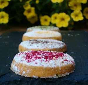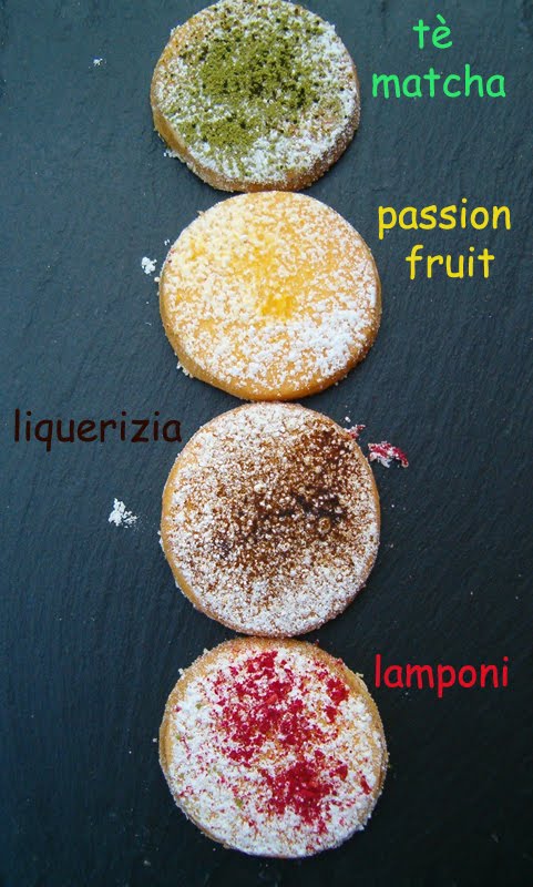 Il I° esperimento,quando il caldo era ancora sopportabile,dei bottoni colorati,ovvero piccoli frollini al limone cosparsi di zucchero a velo e frutta liofilizzata.