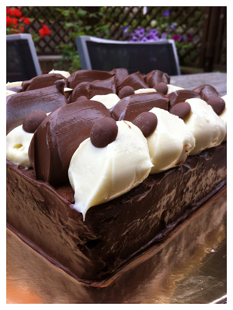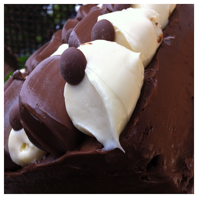 Ricoprire tutta la superficie del dolce con la namelaka al fondente e con l’aiuto di due sacche à poche decorare la superficie della torta con i due tipi di namelaka.