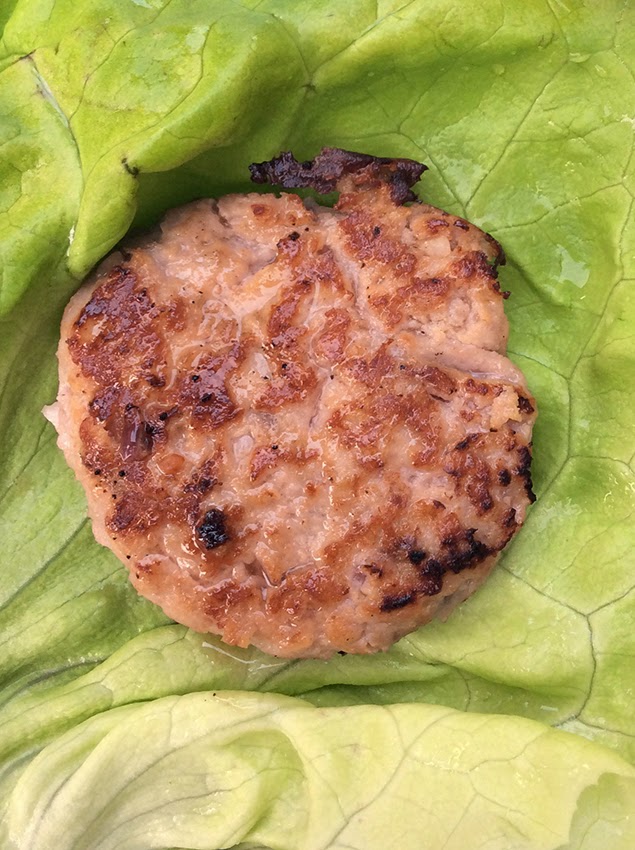 Ho mescolato alcuni cucchiai di senape e della cipolla di Tropea tritata finemente a del macinato di tacchino,ho formato delle piccole svizzere che ho servito su una grande foglia di lattuga.