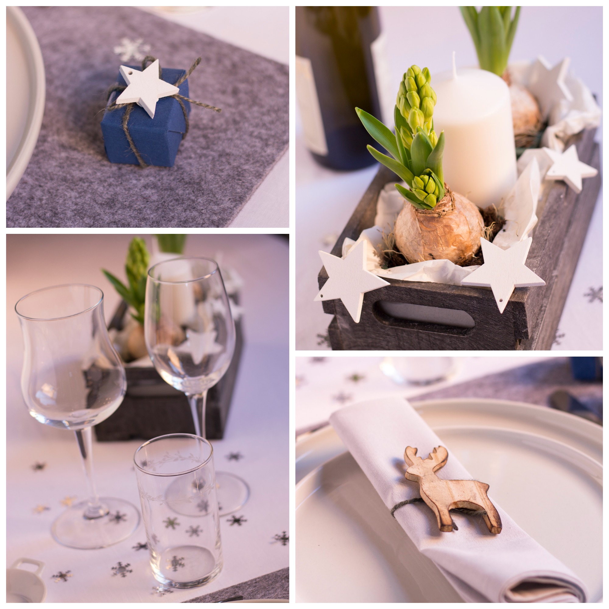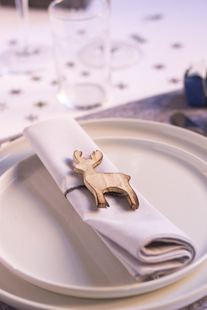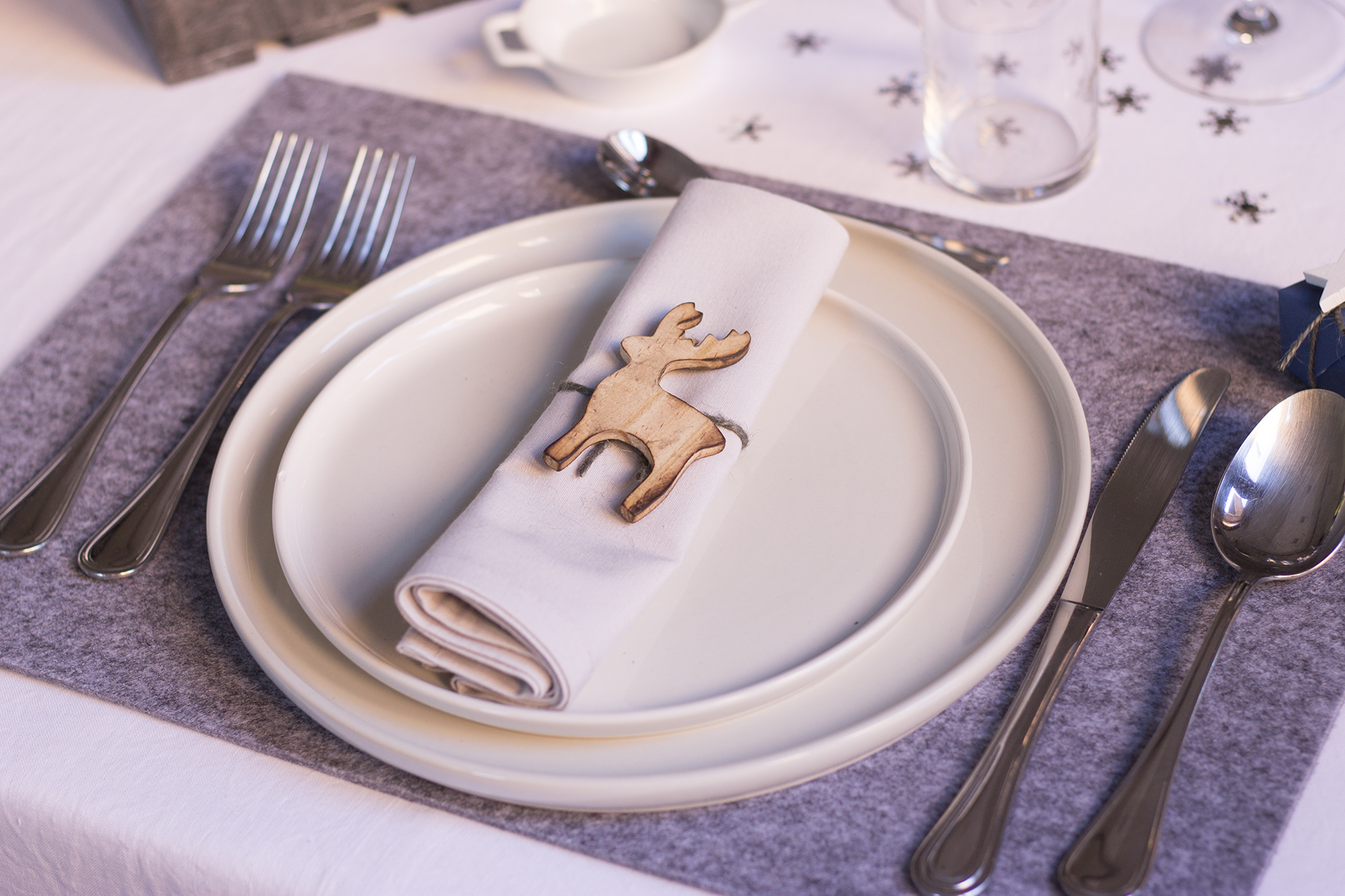 Ho apparecchiato con una tovaglia bianca di cotone,tovaglietta grigia in feltro,piatto e piattino bianco,sopra il tovagliolo ripiegato e fermato dal segnaposto,un piccola alce in legno,posate e bicchieri (tre quello da acqua ed i due da vino) ed un piccolo omaggio per gli ospiti fasciato con carta blu e decorato.