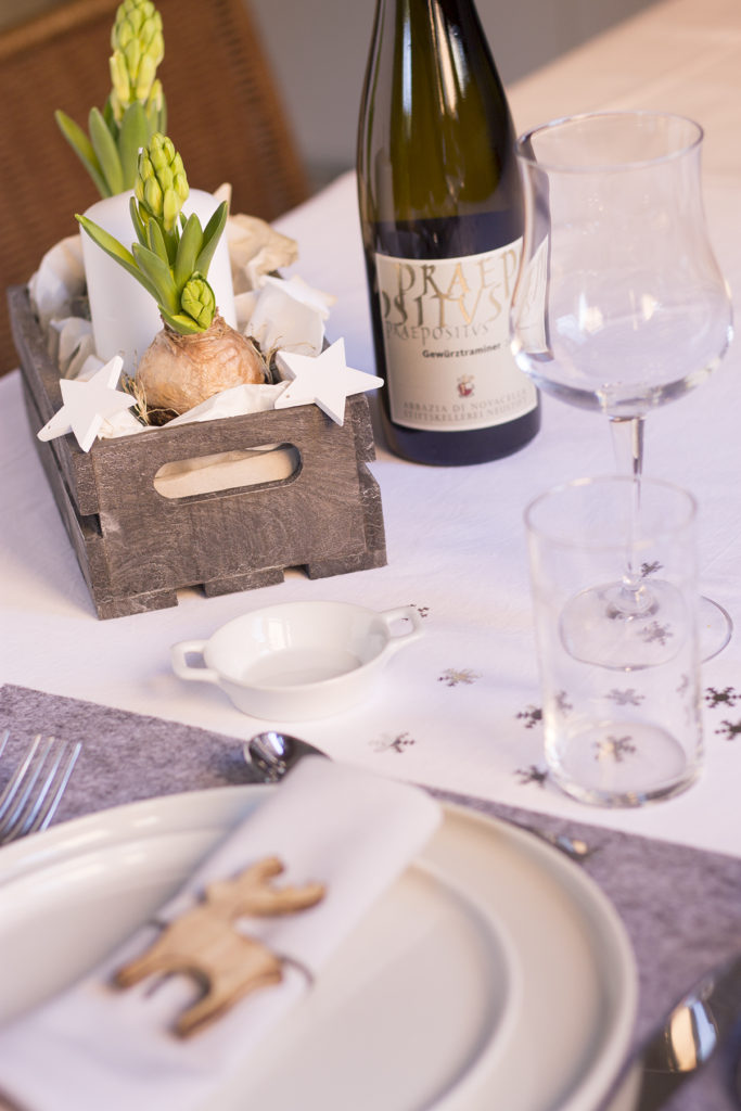 l’ho creato prendendo una cassettina di legno grigio scuro riempita con carta bianca,due giacinti, una grande candela bianca e stelline sempre bianche a decorare. A completare la decorazione della tavola piccoli fiocchi di neve argentati.